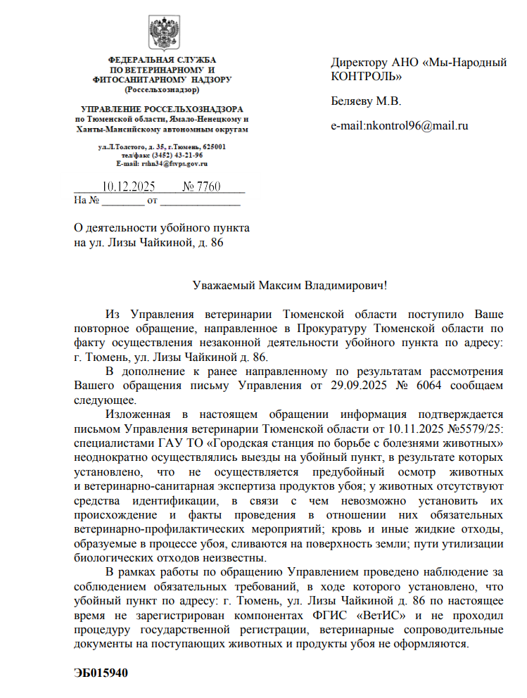 Ведомство также сообщило, что нелегальный убойный пункт по адресу Лизы Чайкиной, 86 до сих пор не зарегистрирован в ФГИС «ВетИС», а ветеринарные сопроводительные документы не оформляются. Несмотря на повторный запрос Россельхознадзора о выдаче разрешения на проведение контрольного мероприятия, прокуратура вновь отказала. Собственнику объявлены два предостережения о недопустимости нарушений, а собранные материалы переданы в Росреестр для принятия мер в пределах его компетенции.