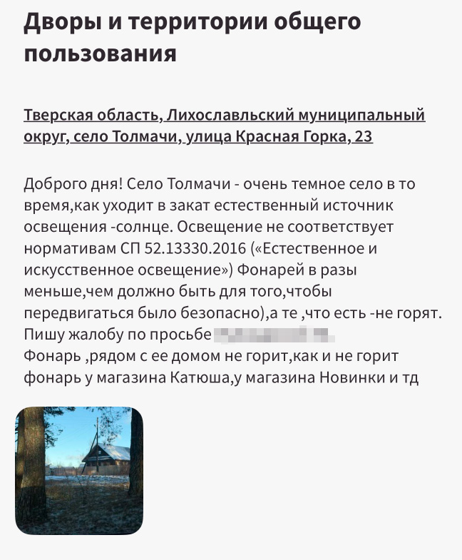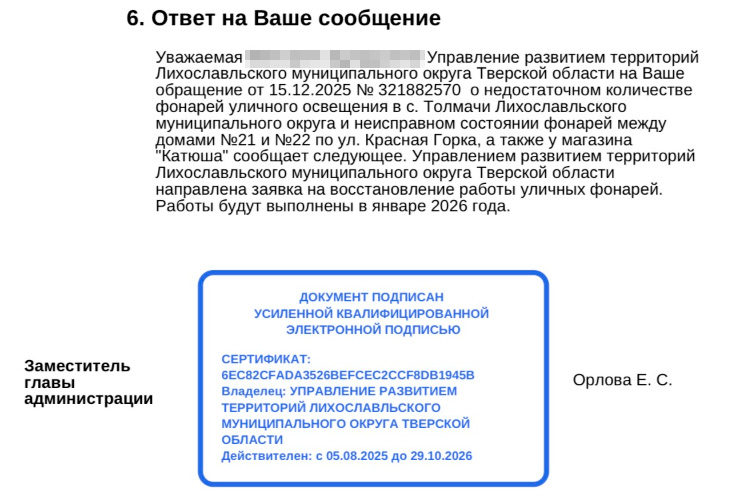 Изначально обращение было подано в ноябре 2025 года через портал «Решаем вместе». На него Администрация Лихославльского муниципального округа ответила, что работы по восстановлению уличного освещения должны были быть выполнены в январе 2026 года, однако до настоящего времени они так и не были проведены.