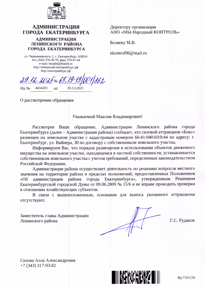 Власти указали, что порядок размещения подобных объектов на частной земле определяется собственником с учётом требований законодательства, а районная администрация не наделена полномочиями проводить проверки хозяйствующих субъектов. В связи с этим оснований для демонтажа или выноса аттракциона не имеется.
