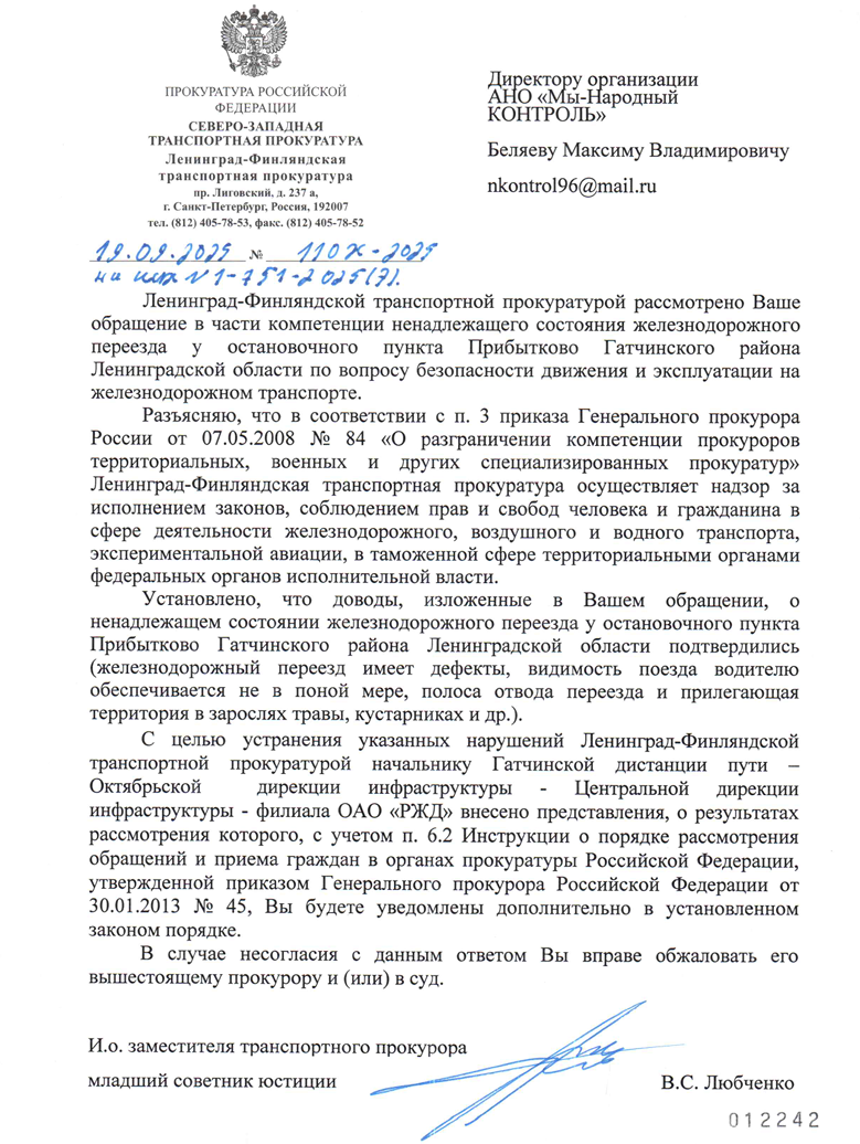 Благодарим неравнодушных граждан за Ваши обращения. Если Вы не согласны с данным ответом Ленинград-Финляндской транспортной прокуратуры, пожалуйста, сообщите об этом Нам (желательно с фото/видео доказательствами выполнения работы в неполном объеме или ее невыполнении).