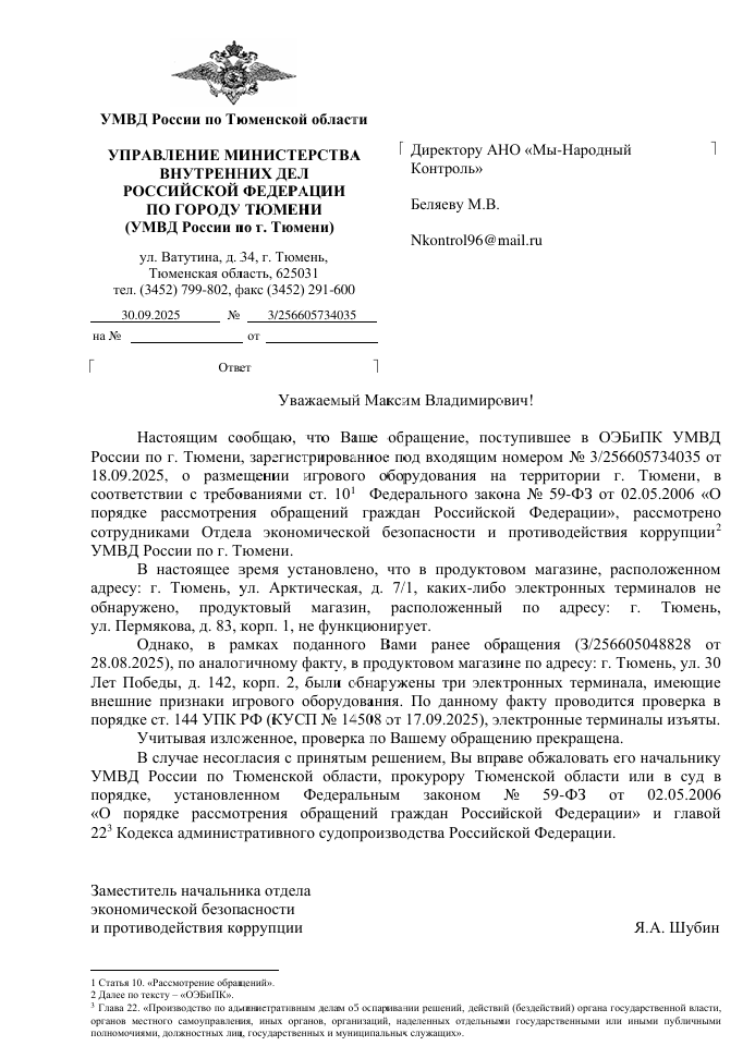 В августе из Тюмени было получено несколько обращений о незаконном размещении игрового оборудования в торговых точках Тюмени. В обращениях были указаны адреса: ул. Арктическая, 7/1, ул. Пермякова, 83, корп. 1, а также ул. 30 лет Победы, 142, корп. 2, где, по словам заявителя, находились игровые аппараты.