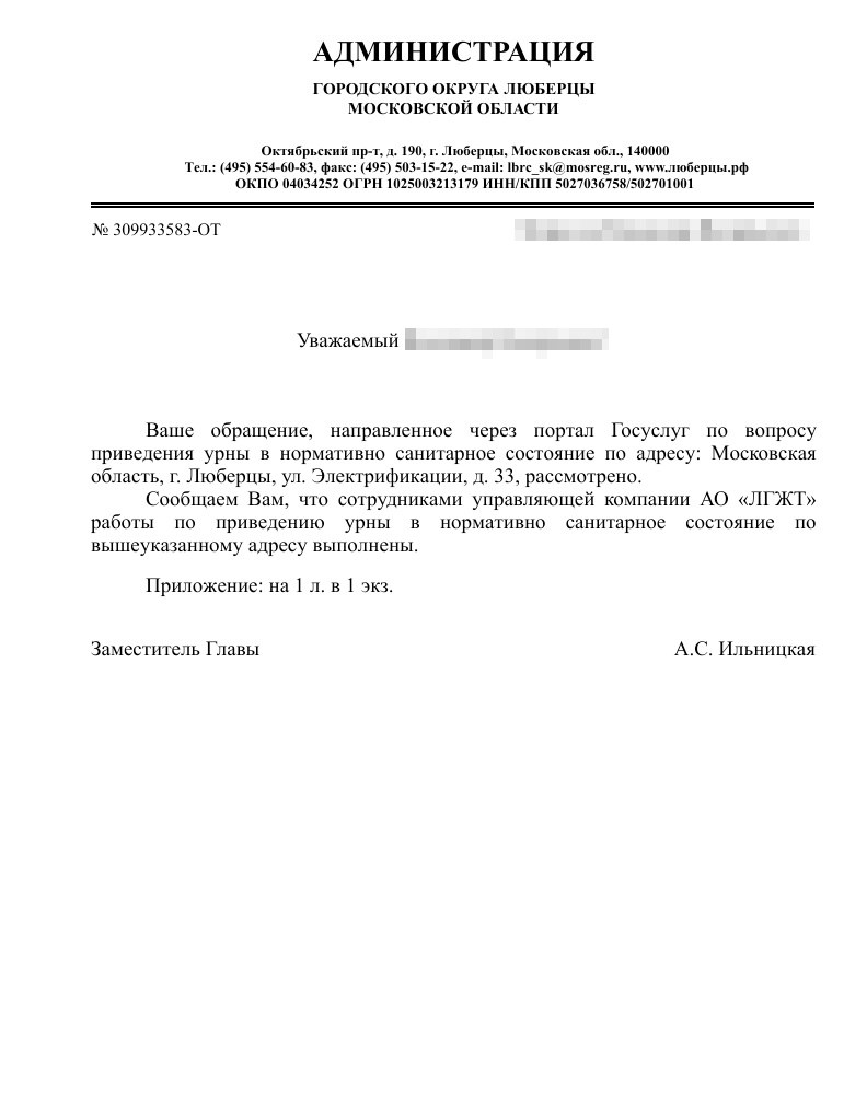В ответе на обращение сообщается, что сотрудники управляющей компании АО «ЛГЖТ» привели урну в нормативно санитарное состояние. Таким образом, работы по уборке мусора были выполнены, и ситуация восстановлена.