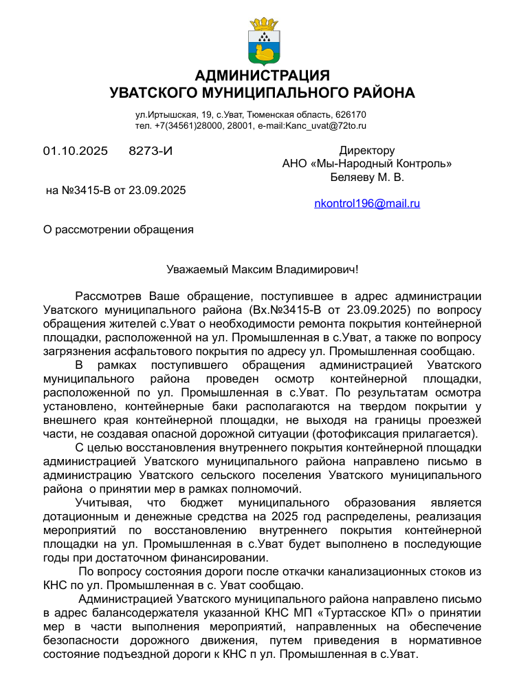Рассмотрев обращения, администрация Уватского муниципального района провела проверку контейнерной площадки. В ответе утверждается, что баки располагаются “у внешнего края площадки” и “не создают опасной дорожной ситуации”. При этом администрация признала, что внутреннее покрытие действительно требует восстановления, но объявила, что ремонт откладывается на неопределенный срок из-за отсутствия денег в бюджете.
