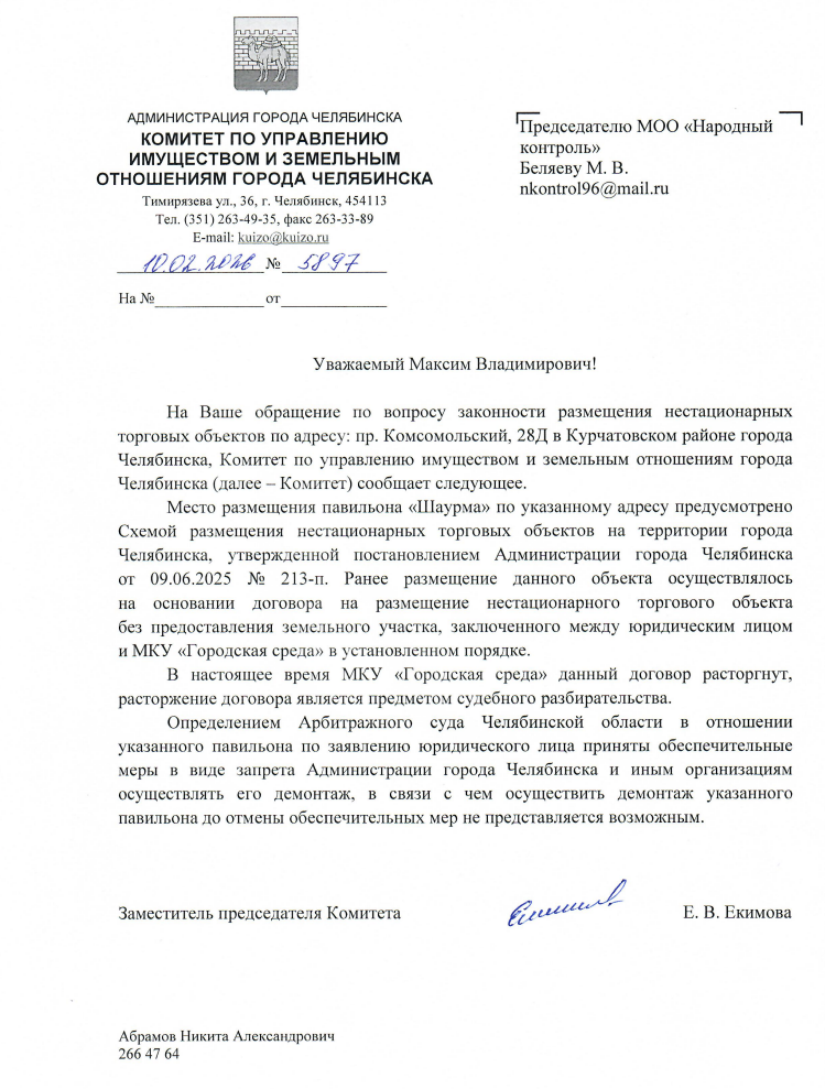 По этому вопросу был получен ответ от Комитета по управлению имуществом Челябинска по вопросу законности размещения этого павильона.