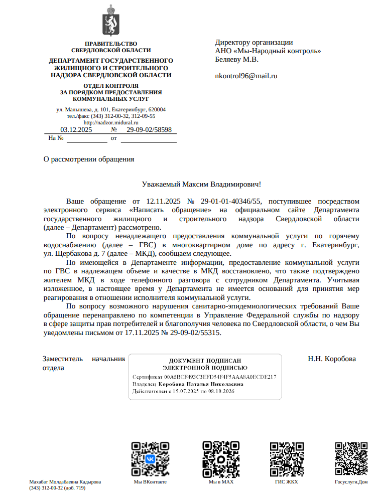 В ответ Госжилинспекция Свердловской области сообщила, что по имеющимся данным подача горячей воды в доме была восстановлена в полном объёме и надлежащем качестве. Это также подтвердил один из жителей в телефонном разговоре с представителем ведомства.