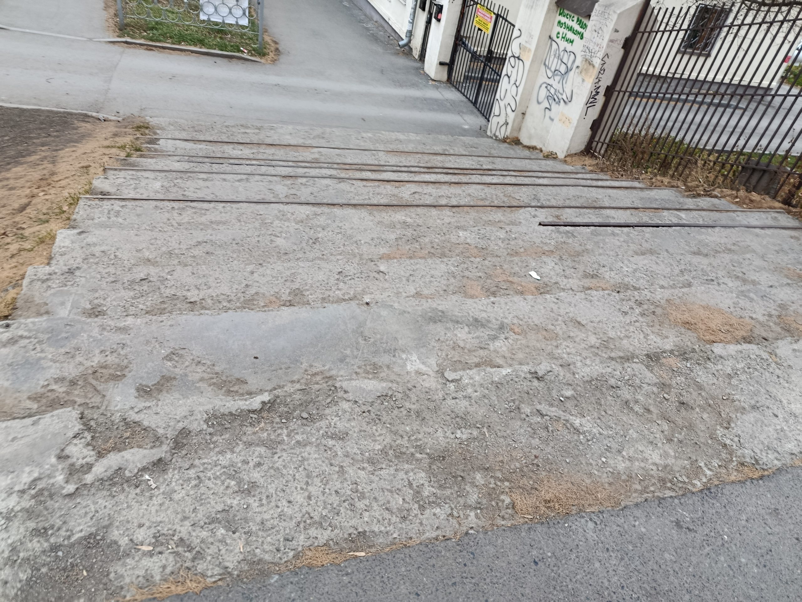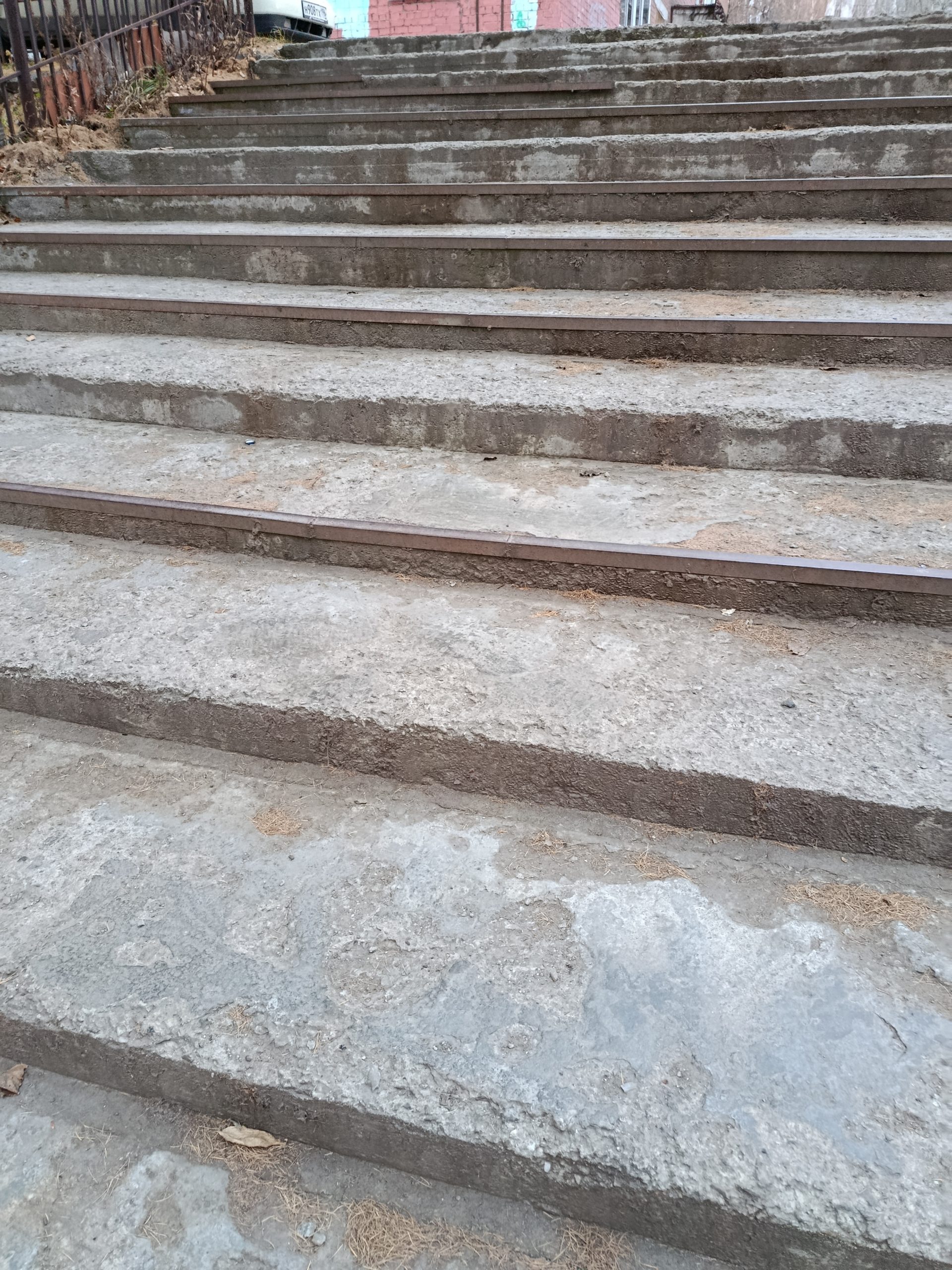 24.10.2025, 18:30. г. Екатеринбург, ул. Мельникова, 3. Лестница находится в разрушенном состоянии. Несколько лет наблюдаю, как школьники из двух соседних школ, студенты медицинского колледжа и педагогического института падают на ней. Также в общежитии проживают люди с инвалидностью по зрению, которые с большим трудом, с тростью в руках преодолевают эти полуразвалившиеся ступени. Необходимо построить новую лестницу.
