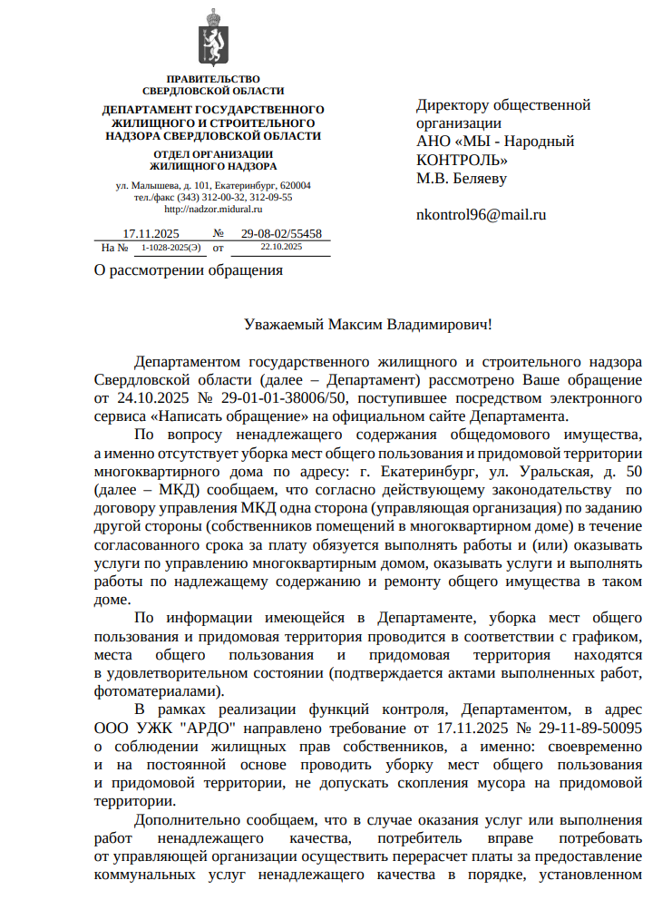 21 октября собственники квартир в доме по улице Уральская, 50 направили обращение о систематическом бездействии управляющей компании ООО УЖК «АРДО». По словам жильцов, с лета 2025 года не проводится уборка придомовой территории и мест общего пользования, во дворе скопились горы мусора, а в подъездах царит антисанитария. При этом УК продолжает взимать полную плату за содержание жилья, не делая перерасчет за неоказанные услуги.