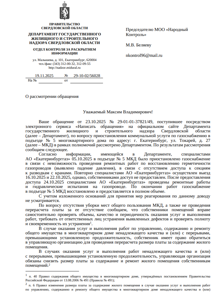 В ответе сообщается, что приостановка газоснабжения произошла из-за падения давления и невозможности доступа специалистов к газовым разводкам. После предоставления доступа 24 октября специалисты АО «Екатеринбурггаз» провели ремонтные работы и восстановили газоснабжение.