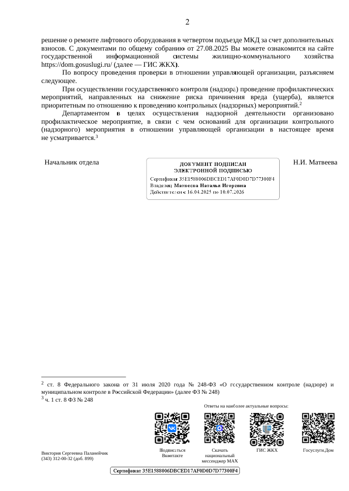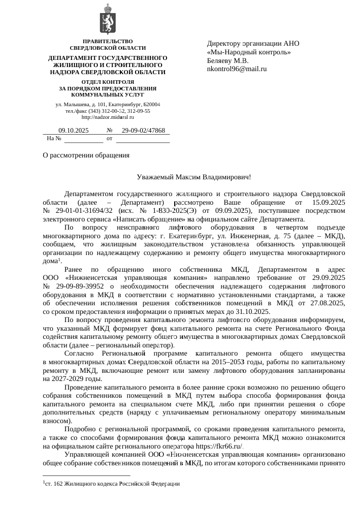 Департамент жилищного надзора сообщил, что уже направил управляющей компании требование устранить нарушения до 31 октября 2025 года. Капитальный ремонт лифтов по программе запланирован на 2027-2029 годы, но собственники на общем собрании уже приняли решение о досрочном ремонте за счёт дополнительных взносов. В настоящее время проводятся профилактические мероприятия, а оснований для внеплановой проверки УК нет.