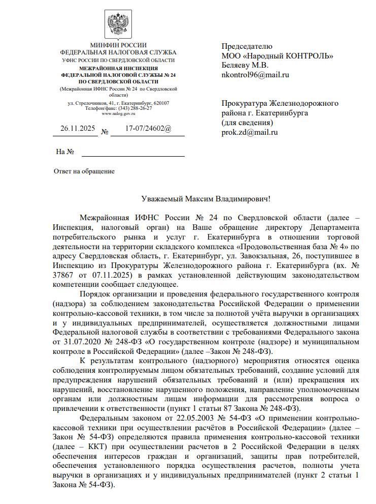 На обращение был получен официальный ответ из Межрайонной ИФНС России № 24 по Свердловской области.