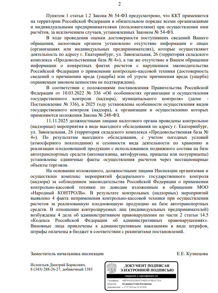 Налоговая служба напомнила о требованиях законодательства к применению контрольно-кассовой техники и отметила, что в поступившем обращении не было указано конкретных предпринимателей или подтверждённых фактов нарушений. Тем не менее 11 ноября 2025 года инспекция провела выездное обследование территории овощебазы. По результатам проверки выявлено четыре случая неприменения ККТ при продаже плодоовощной продукции с автотранспорта. В отношении предпринимателей возбуждены дела по ч. 2 ст. 14.5 КоАП РФ, нарушители оштрафованы, штрафы оплачены.