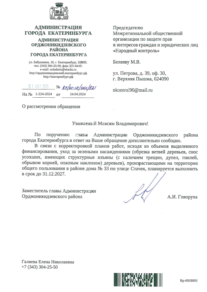 В первоначальном ответе администрации Орджоникидзевского района сообщалось, что уход за зелёными насаждениями в районе дома №33 по улице Стачек планировалось выполнить в 2024-2025 годах в рамках выделенного финансирования.