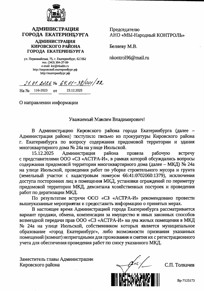 На это обращение был получен ответ от администрации Кировского района города.
