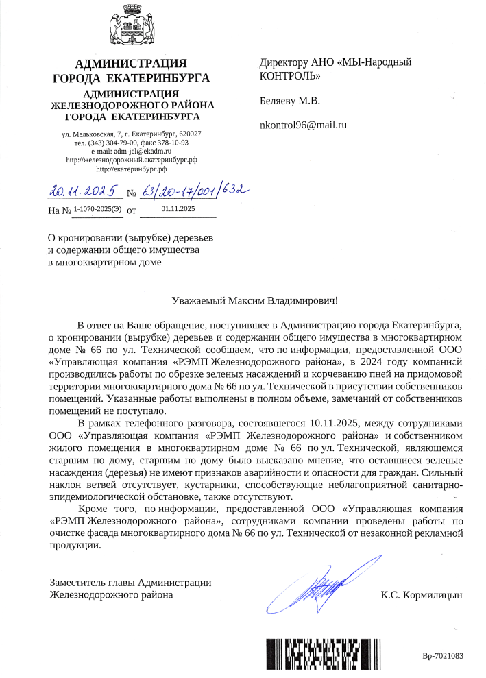 По данным ООО «УК „РЭМП Железнодорожного района“», в 2024 году на территории дома уже проводилась обрезка деревьев и корчевание пней в присутствии жильцов, и работы были выполнены полностью. Старший по дому сообщил сотрудникам УК, что оставшиеся деревья не являются аварийными, наклонённых опасных ветвей нет, а кустарники, нарушающие санитарное состояние, отсутствуют. Кроме того, управляющая компания убрала незаконные рекламные материалы с фасада здания.