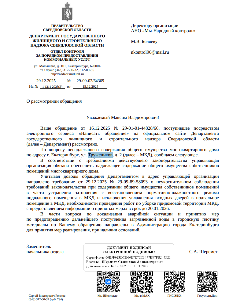 На это обращение был получен ответ от Департамента государственного жилищного и строительного надзора Свердловской области.