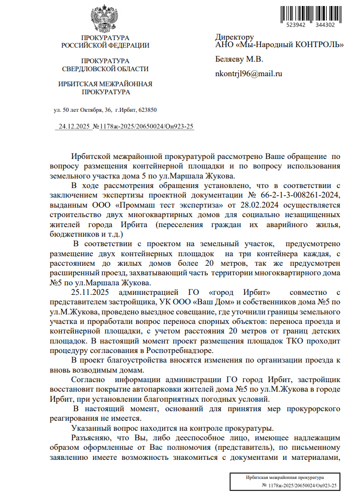 В конце ноября жители дома № 5 на улице Маршала Жукова в Ирбите обратились за помощью из-за действий застройщика, ведущего строительство жилого комплекса рядом с их домом. По словам собственников, дорога к новым домам была спроектирована и фактически проложена по территории их придомовой парковки, которая относится к общему имуществу дома. Строители начали демонтировать плиты, бордюры и использовать тяжёлую технику, несмотря на протесты жильцов.