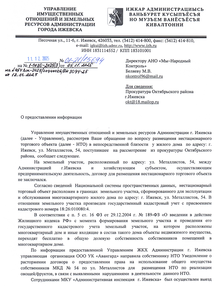Теперь был получен ответ от Управления имущественных отношений и земельных ресурсов Администрации Ижевска.