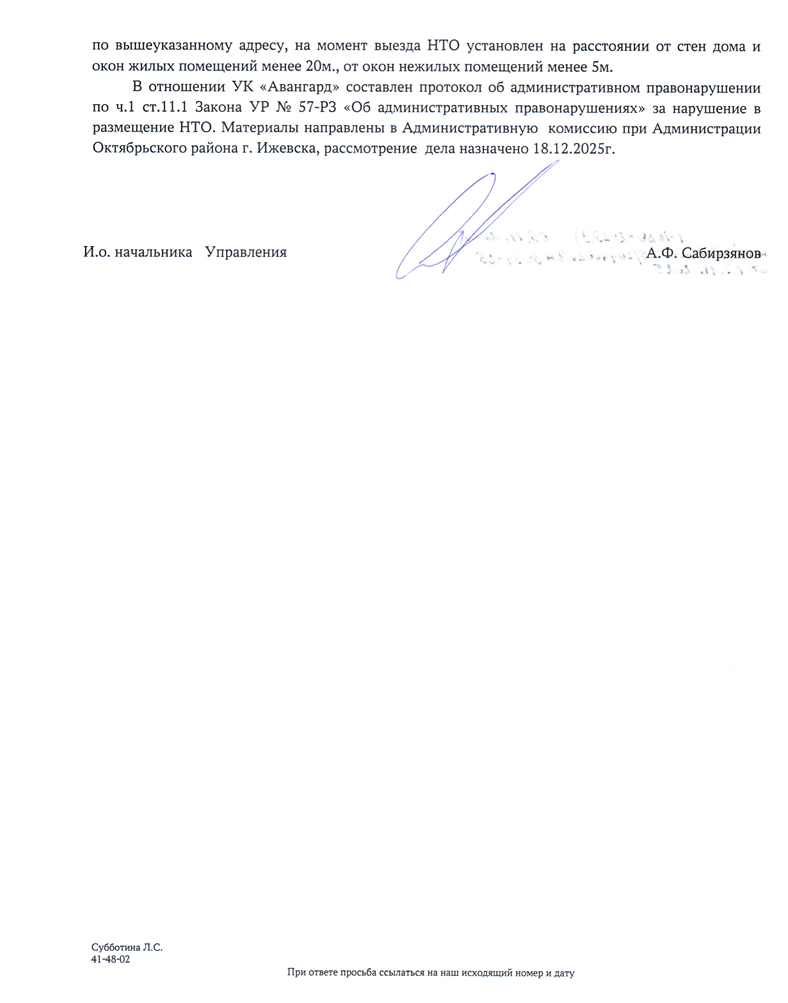 Проверка Административной инспекции выявила нарушение нормативных расстояний от ларька до окон здания, в связи с чем на УК составлен протокол по ч. 1 ст. 11.1 Закона УР № 57-РЗ. Материалы направлены в административную комиссию, рассмотрение назначено на 18 декабря 2025 года.