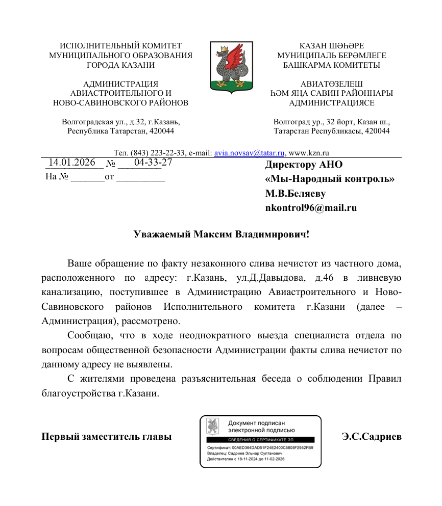 В ответе администрации Авиастроительного и Ново-Савиновского районов Казани сообщается, что обращение было рассмотрено, а специалисты отдела общественной безопасности неоднократно выезжали по указанному адресу. По результатам проверок факты слива нечистот выявлены не были. При этом с жителями дома проведена разъяснительная беседа о необходимости соблюдения Правил благоустройства города.