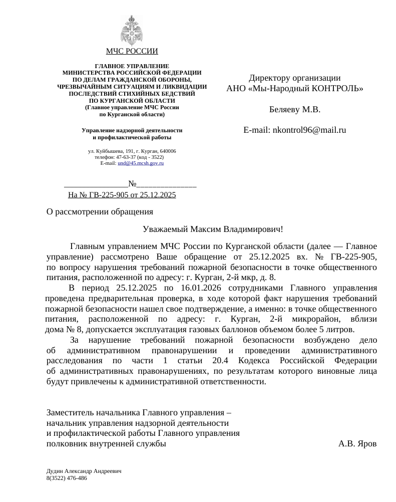 По итогам рассмотрения обращения была проверку и подтвердило нарушение требований пожарной безопасности. Было установлено, что в точке общественного питания использовались газовые баллоны объёмом более допустимых норм. В связи с этим возбуждено дело об административном правонарушении, начато административное расследование, по результатам которого виновные лица будут привлечены к ответственности.