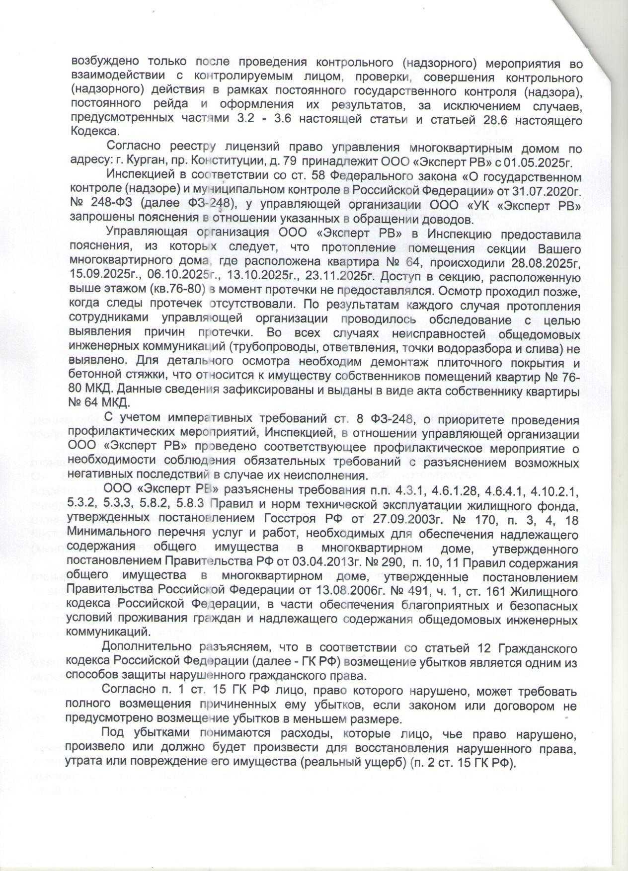 В конце декабря из Кургана было получено обращение о систематическом затоплении квартиры на проспекте Конституции, 79, которое, по словам заявителя, вызывает разрушение несущих конструкций дома и создает угрозу жизни проживающих. Жильцы утверждают, что причиной являются квартиранты соседних квартир, а управляющая компания и полиция не приняли эффективных мер.