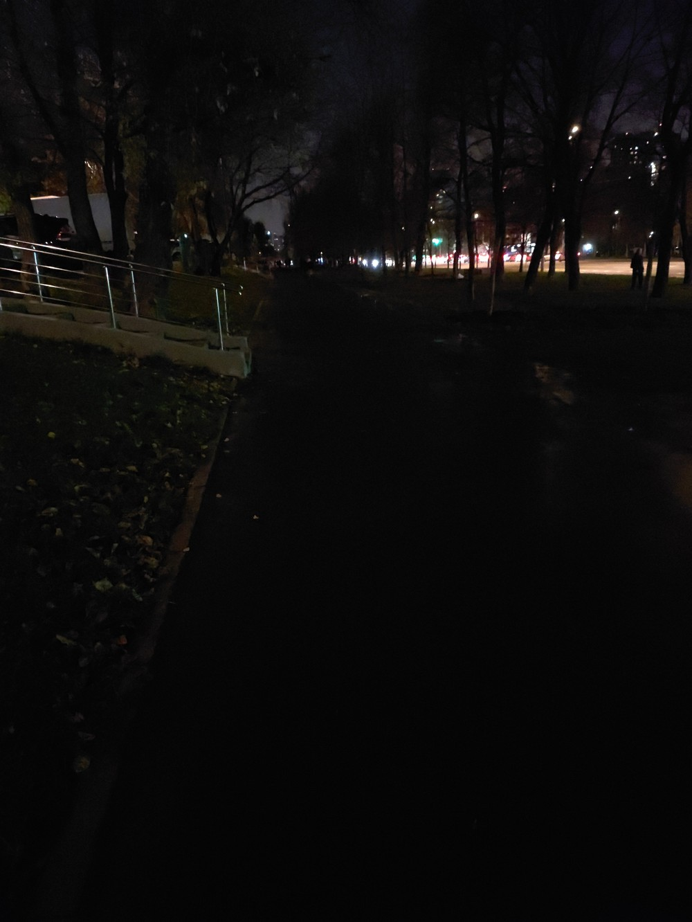 Пешеходный переход на Нахимовском проспекте полностью лишён освещения. Ничего не видно, тротуар не освещён.