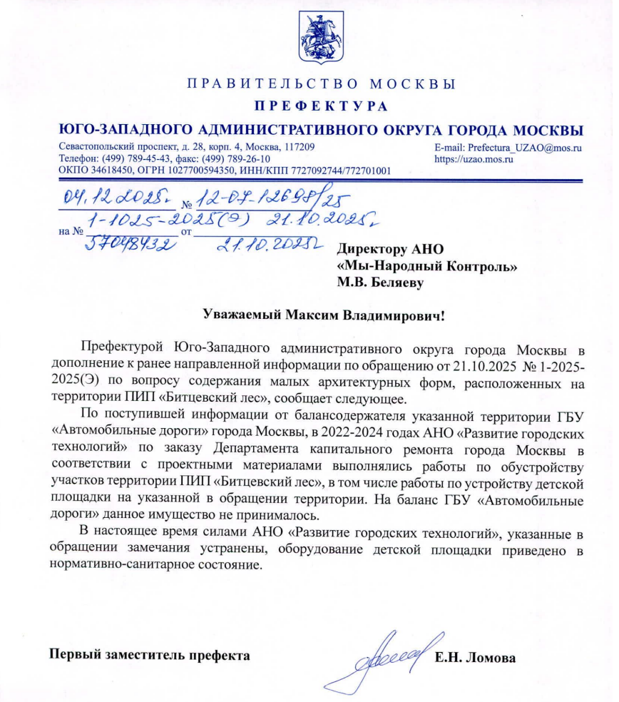 В ответе префектура сообщила, что работы по обустройству этой детской площадки выполнялись в 2022–2024 годах АНО «Развитие городских технологий» по заказу Департамента капитального ремонта города Москвы. На баланс ГБУ «Автомобильные дороги» имущество не передавалось. В настоящее время все замечания устранены, а оборудование площадки приведено в нормативно-санитарное состояние силами подрядной организации.