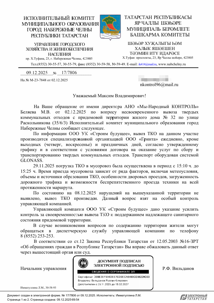 В официальном ответе Исполкома Набережных Челнов со ссылкой на управляющую компанию УК «Строим будущее» указано, что вывоз твердых коммунальных отходов на указанном участке выполняет организация «Гринта» ежедневно, кроме четверга, воскресенья и праздничных дней.
