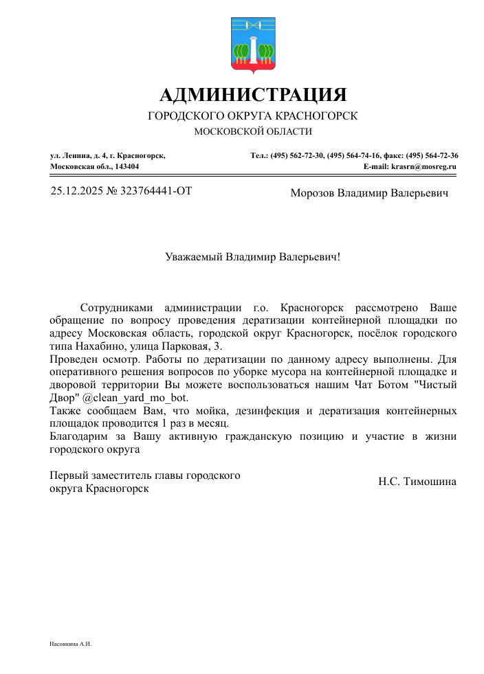 В конце декабря из Красногорска поступило обращение о серьёзной проблеме с крысами на контейнерной площадке возле дома по адресу Парковая улица, 3 в посёлке Нахабино. Жители сообщали, что на площадке постоянно обитает большая стая крыс — от 20 до 30 особей. Жители обеспокоены риском распространения грызунов и просили принять меры для их полного уничтожения.