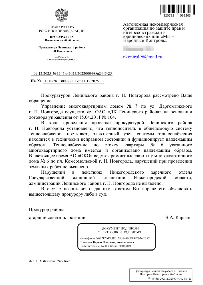 В ответ на жалобу прокуратура Ленинского района Нижнего Новгорода сообщила, что управление многоквартирным домом №7 осуществляет ОАО «ДК Ленинского района» на основании договора управления.