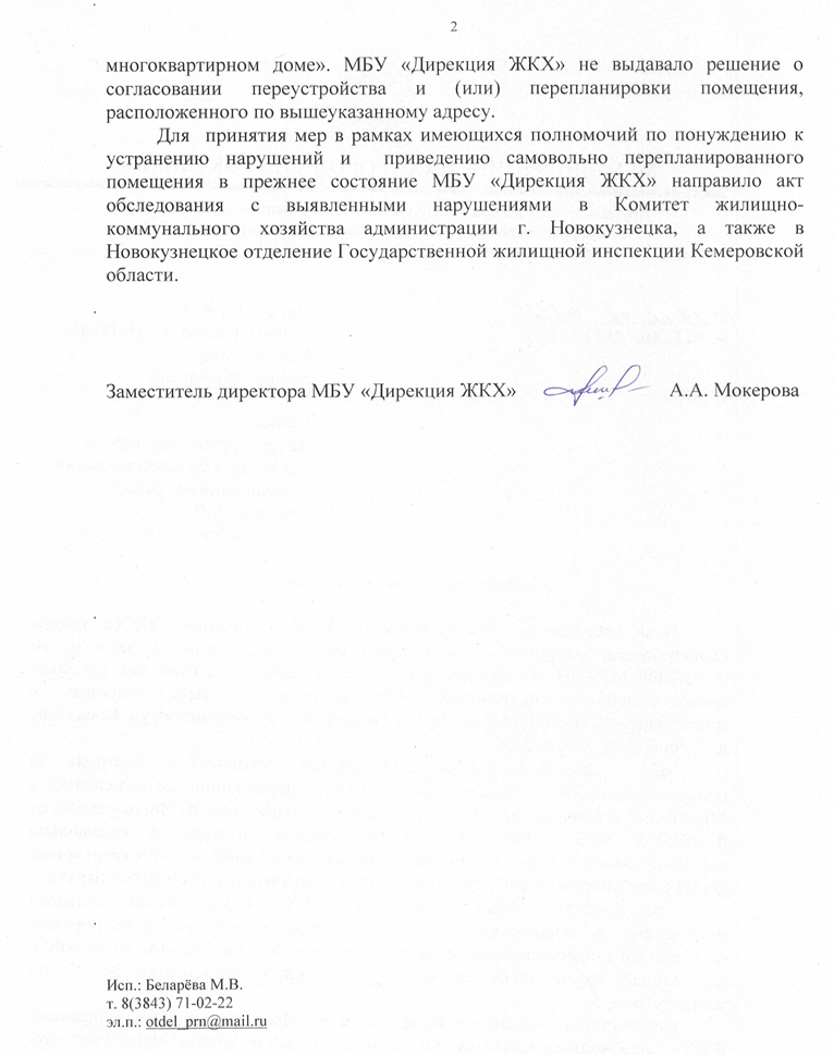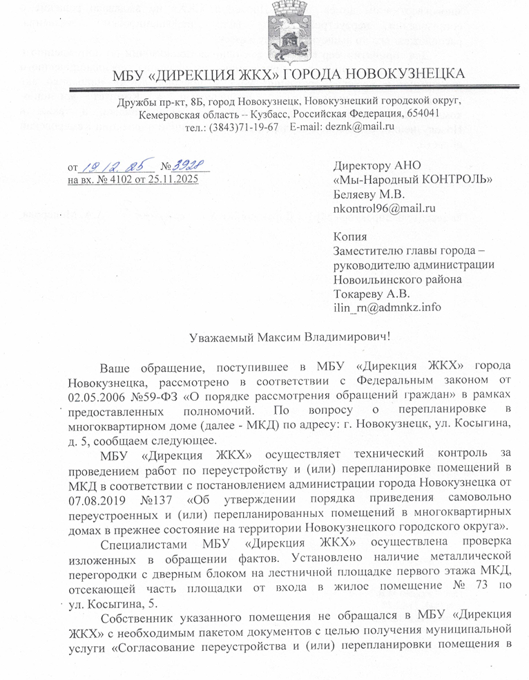 На это обращение был получен ответ от МБУ «Дирекция ЖКХ» Новокузнецка.
