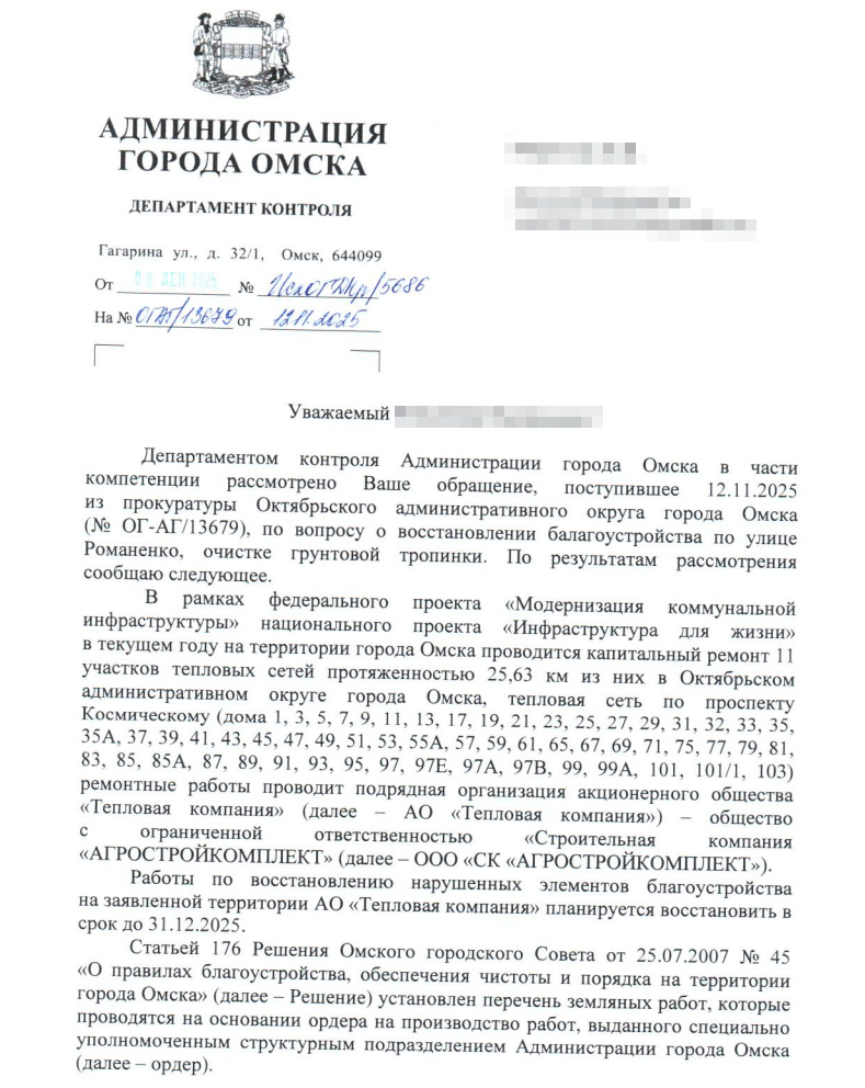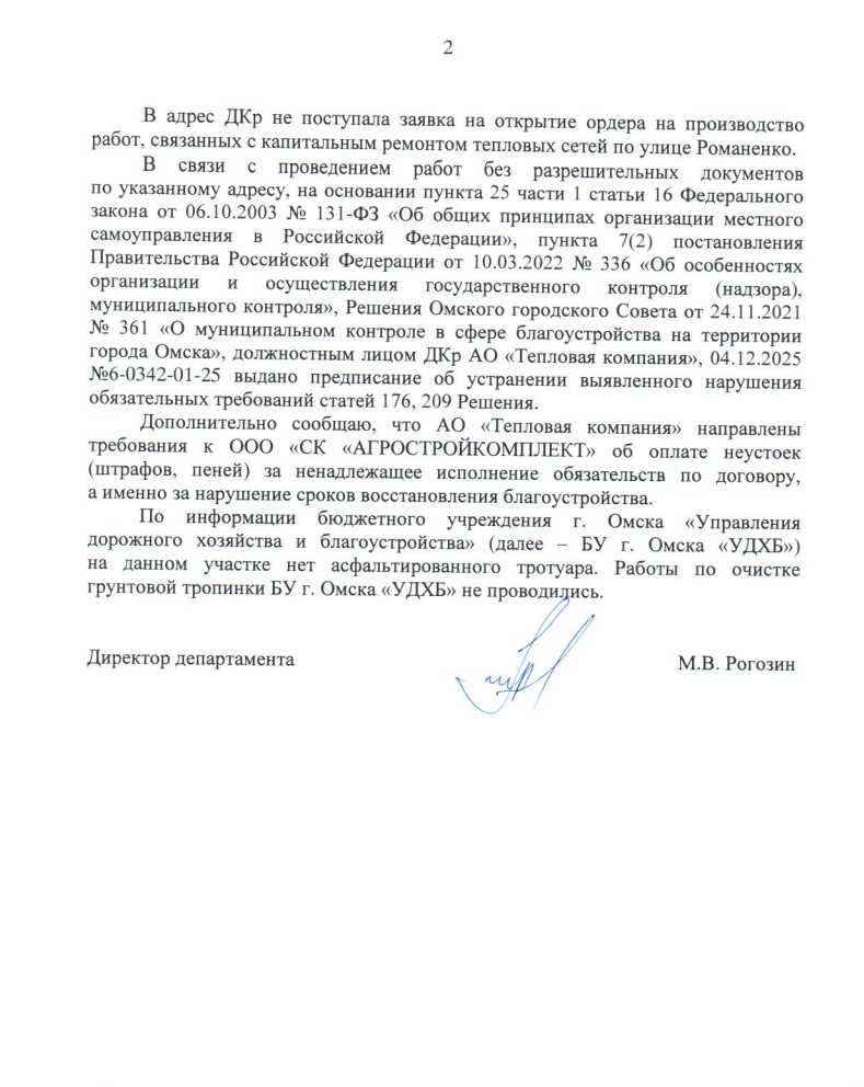 В ответ на обращение Департамент контроля администрации Омска сообщил, что на участке действительно проводились работы по капитальному ремонту тепловых сетей в рамках федерального проекта «Модернизация коммунальной инфраструктуры».