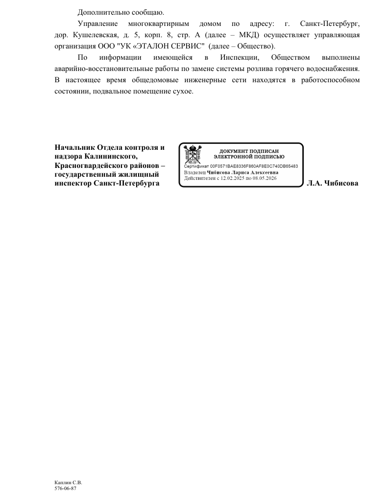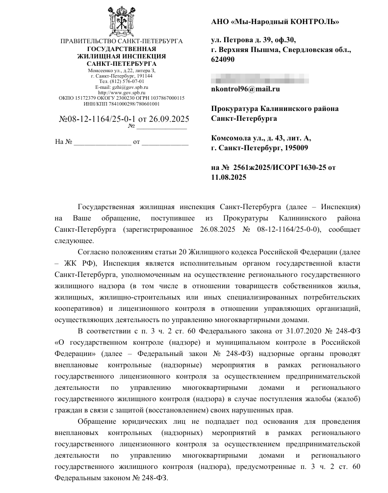 В ответе Государственной жилищной инспекции Санкт-Петербурга сообщается, что проведение внеплановой проверки невозможно, поскольку обращение поступило от юридического лица, а не от граждан. При этом инспекция сослалась на информацию управляющей компании ООО “УК «ЭТАЛОН СЕРВИС”, согласно которой аварийно-восстановительные работы были выполнены, системы находятся в рабочем состоянии, а подвал осушен.