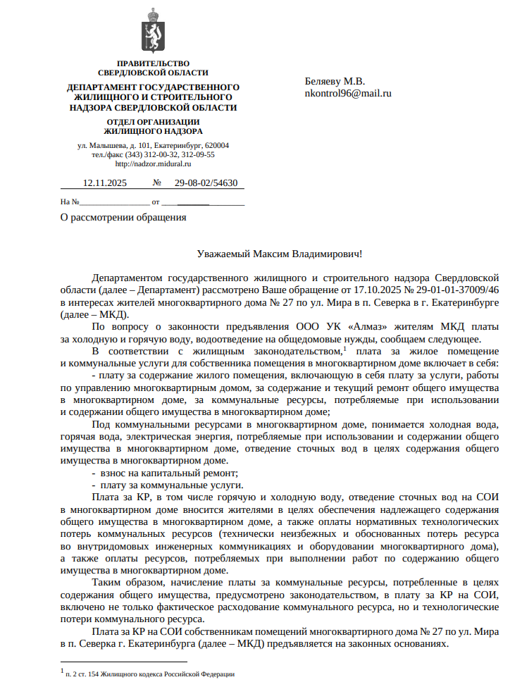 В ответ на обращение Департамент государственного жилищного и строительного надзора Свердловской области разъяснил, что начисление платы за коммунальные ресурсы на общедомовые нужды законно и включает оплату фактического расхода, технологические потери и расходы на содержание общего имущества.