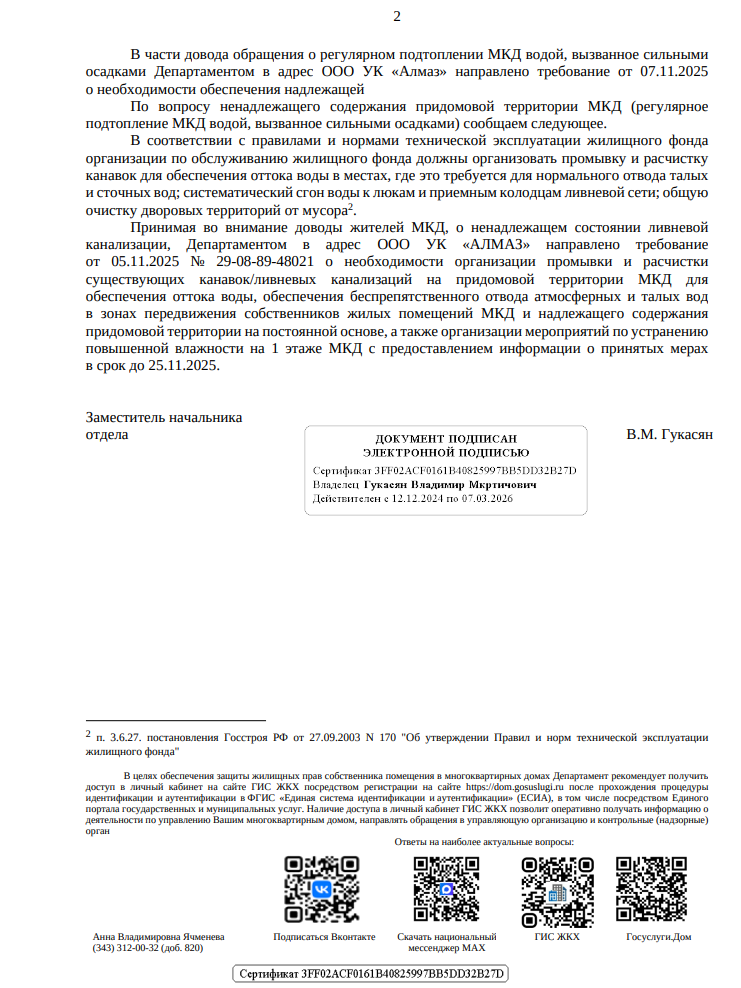 По вопросу подтопления и ненадлежащего состояния придомовой территории Департамент направил в адрес УК «Алмаз» официальные требования о промывке и расчистке канавок и ливневой канализации, обеспечении отвода атмосферных и талых вод, а также устранении повышенной влажности на первом этаже дома. Срок предоставления информации о принятых мерах установлен до 25 ноября 2025 года, а контроль за исполнением требований находится на постоянном контроле Департамента.
