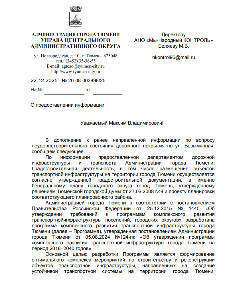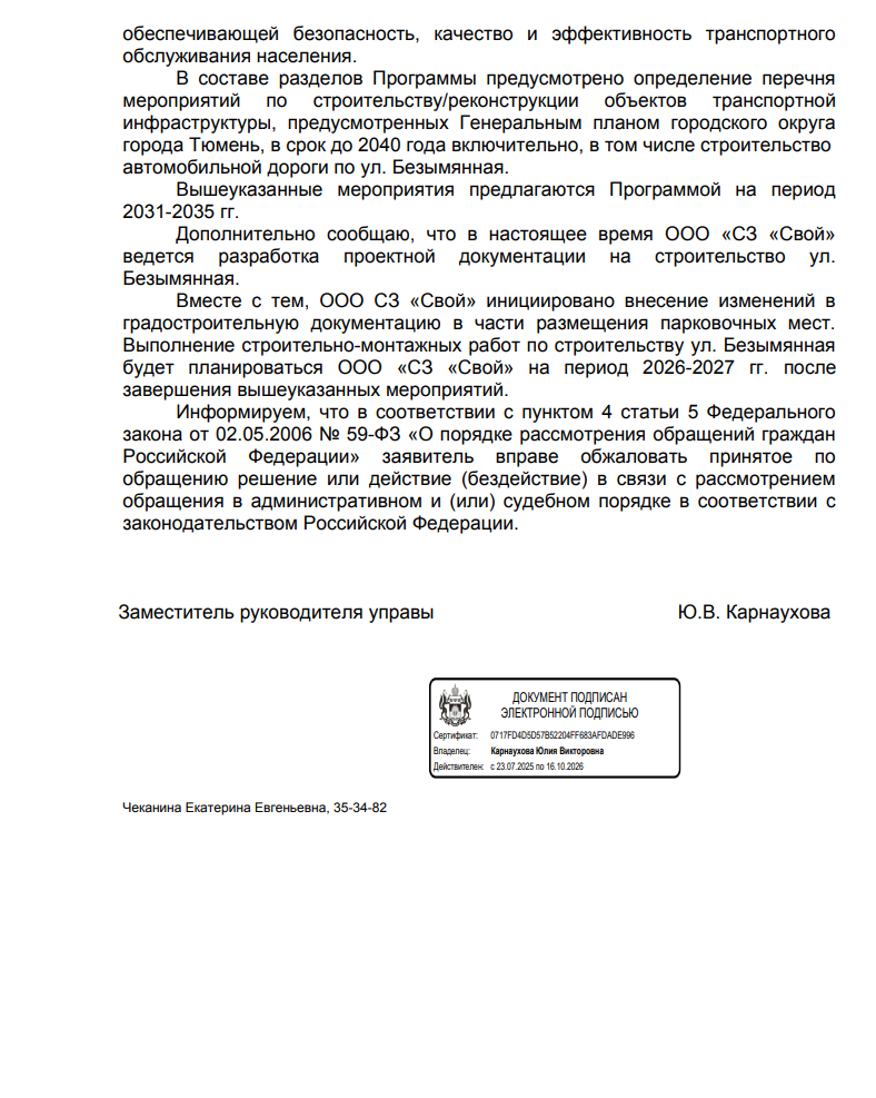 В ответе подтверждается неудовлетворительное состояние дорожного покрытия, однако конкретные сроки решения проблемы отодвинуты на многие годы вперёд. Власти сообщили, что строительство автомобильной дороги по ул. Безымянная включено в долгосрочную «Программу комплексного развития транспортной инфраструктуры города Тюмени на период 2018–2040 годов».