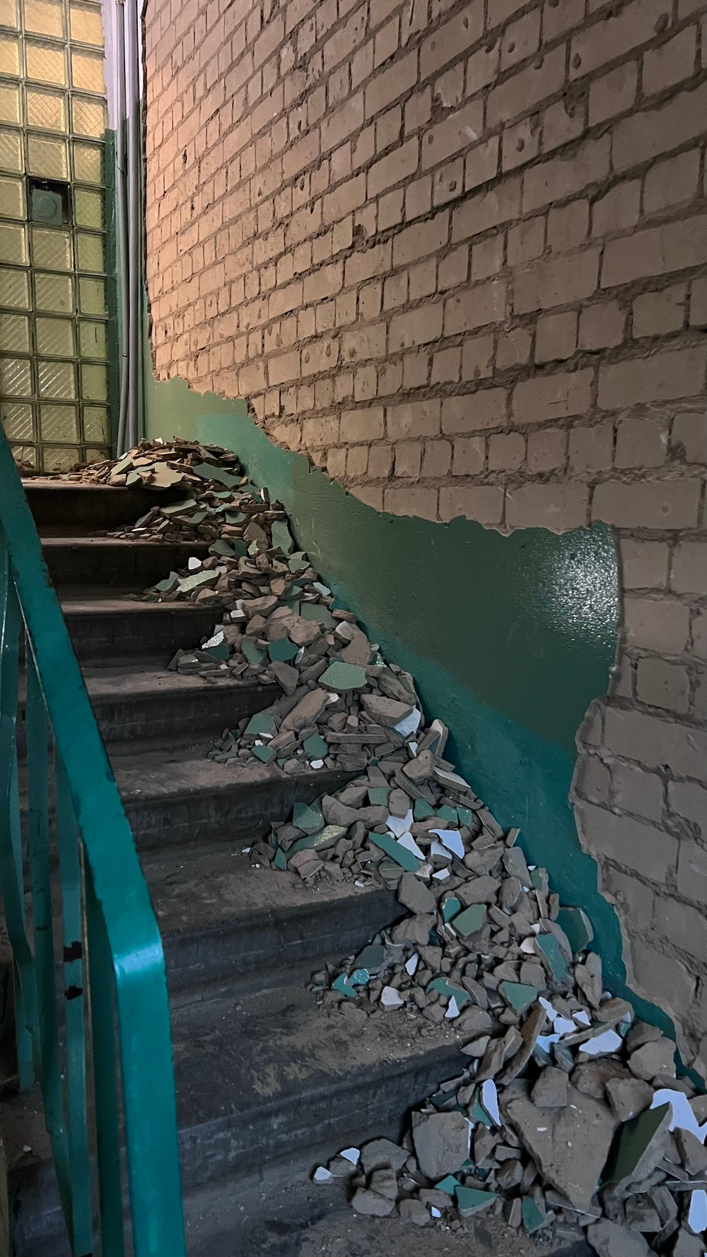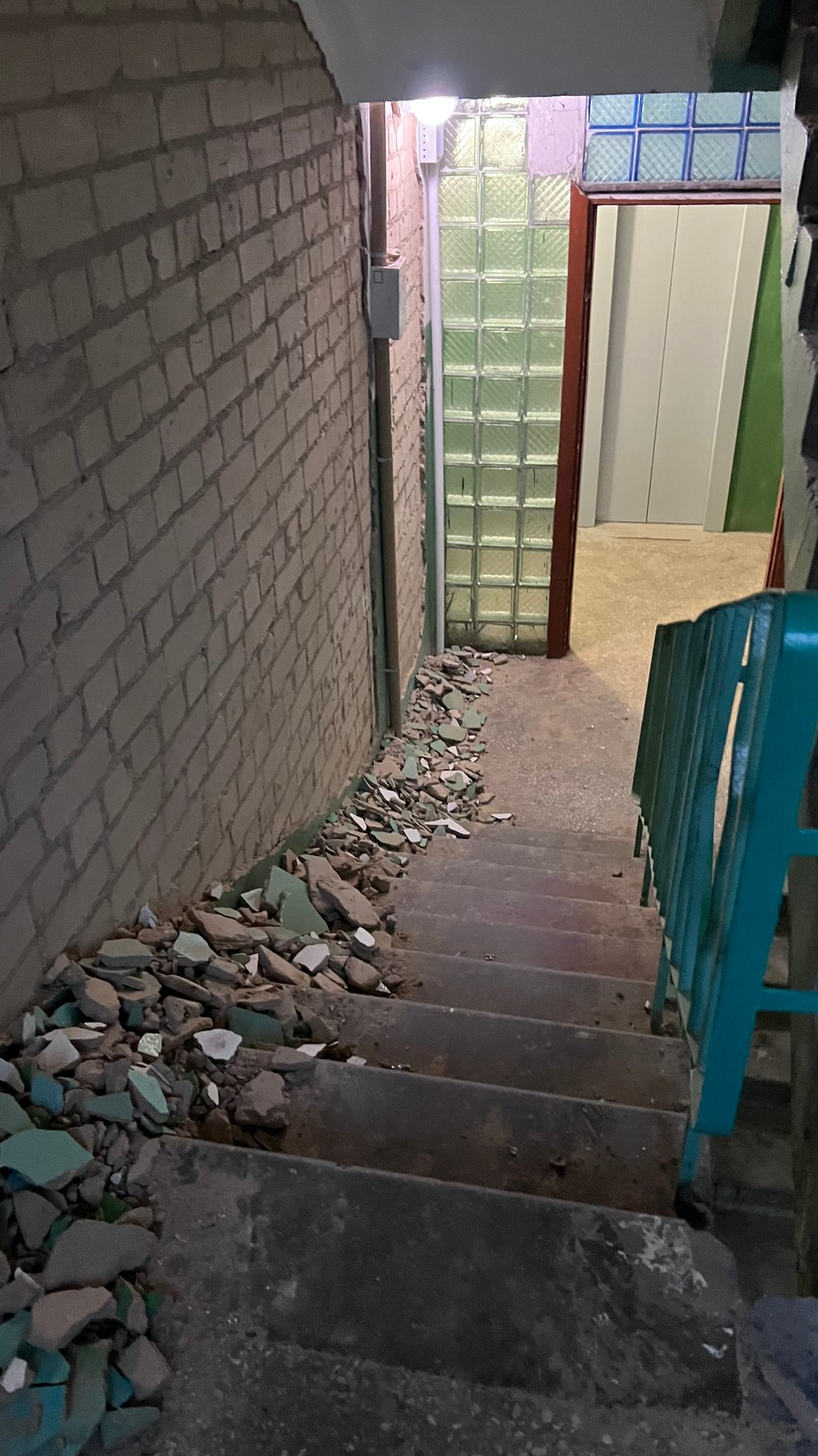 12.10.2025, г. Ярославль, Ленинградский пр-т, д. 111, подъезд 2. В подъезде начались ремонтные работы. В 15:00 рабочих на месте уже не было, зато строительный мусор в подъезде остался. Лифт с середины дня не работал, и всему подъезду приходится спускаться через горы мусора.