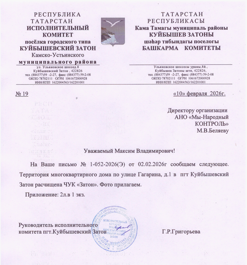 В начале февраля из посёлка Куйбышевский Затон Республики Татарстана было получено обращение о проблеме со снегом во дворе дома на улице Гагарина, 1. Жители сообщали, что с конца января двор и выезд не чистились, из-за чего невозможно было выехать на машине, а в случае экстренной ситуации могла бы не проехать скорая помощь.