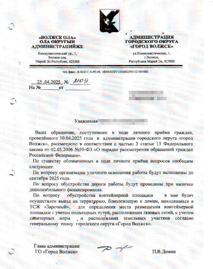 С 2024 г. на многочисленные просьбы установить освещение, контейнерную площадку для ТКО и сделать дорогу по ул. 5-я Заринская администрация г. Волжска отвечает бездействием. После обращения в управление Роспотребнадзора по Республике Марий Эл администрации ГО «Город Волжск» объявлено предостережение о недопустимости нарушения обязательных требований. В ходе личного приема 10.04.2025 г. на указанные проблемы было обещано, что работы будут выполнены до сентября месяца, но до сих пор ничего не сделано. Проживаю по адресу: г. Волжск, ул. 5-я Заринская, д. 11.