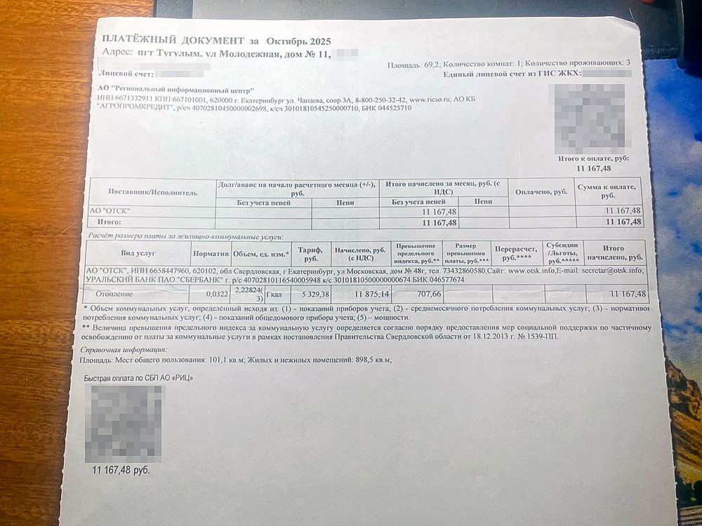 Из поселка Тугулым Свердловской области поступило обращение о необоснованно высоких тарифах на отопление. Житель дома №11 по улице Молодежной предоставил квитанцию от АО «ОТСК» на сумму 11 167,48 рублей. Местные называют эти платежи «кабальными» и просят разобраться в сложившейся ситуации.